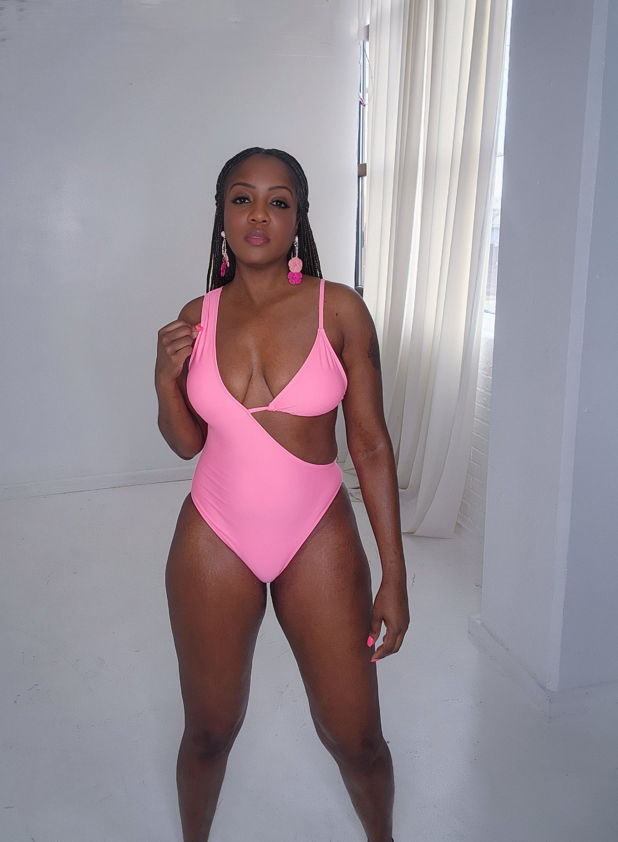 Asymmetrical swimsuit with opposite one cup bra detail.