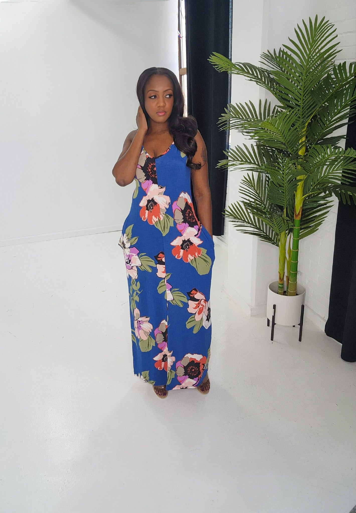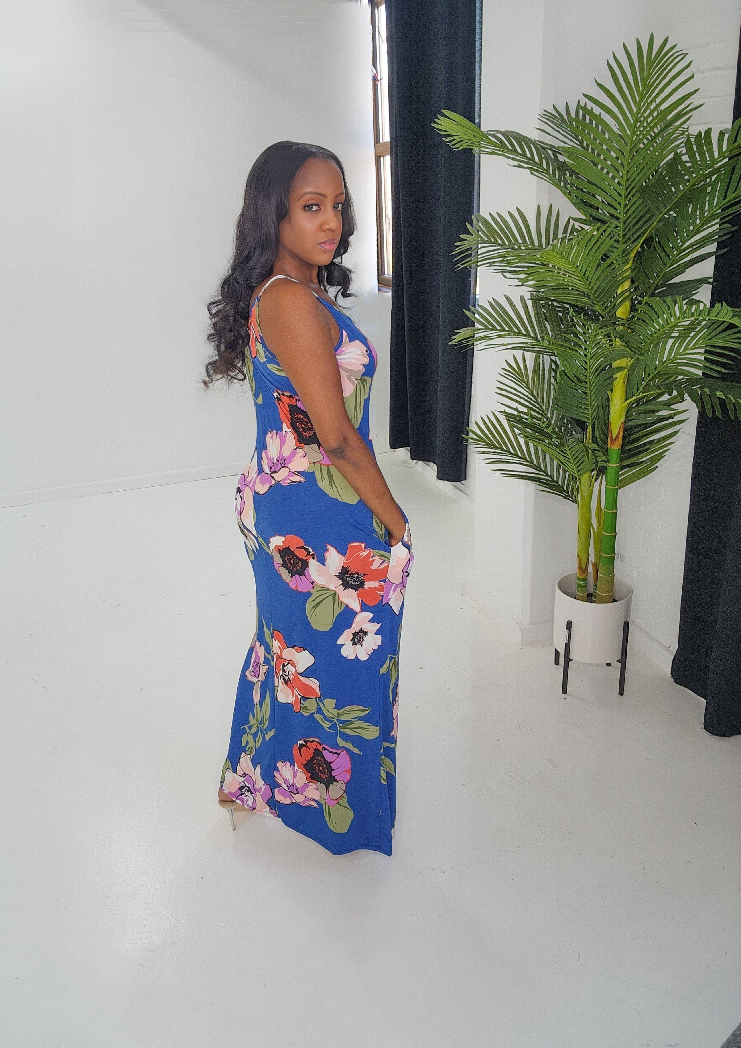 Spaghetti strap floral print boho maxi dress. Dress has pockets