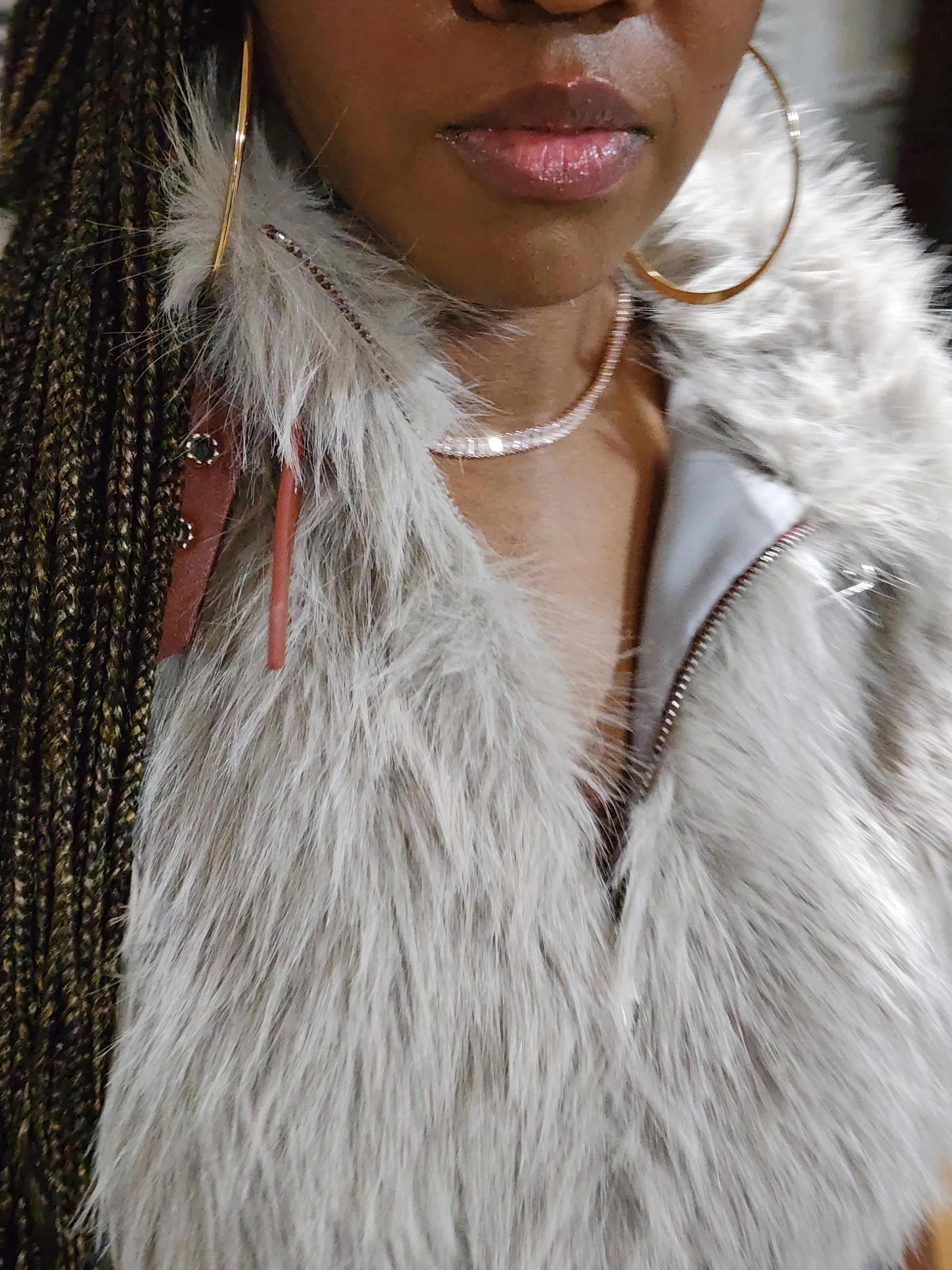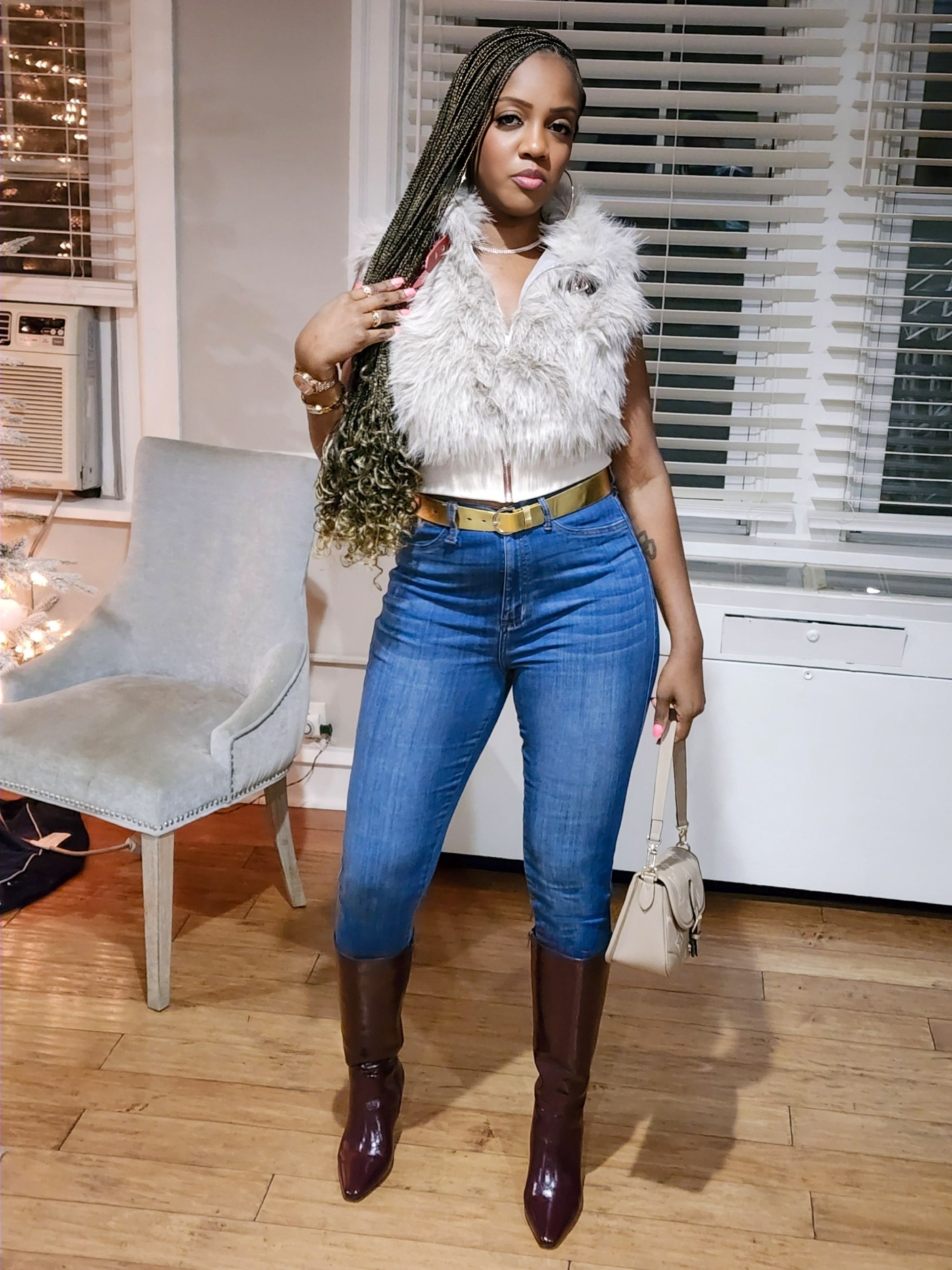 Crop top faux fur vest. Zipper and buckle details.