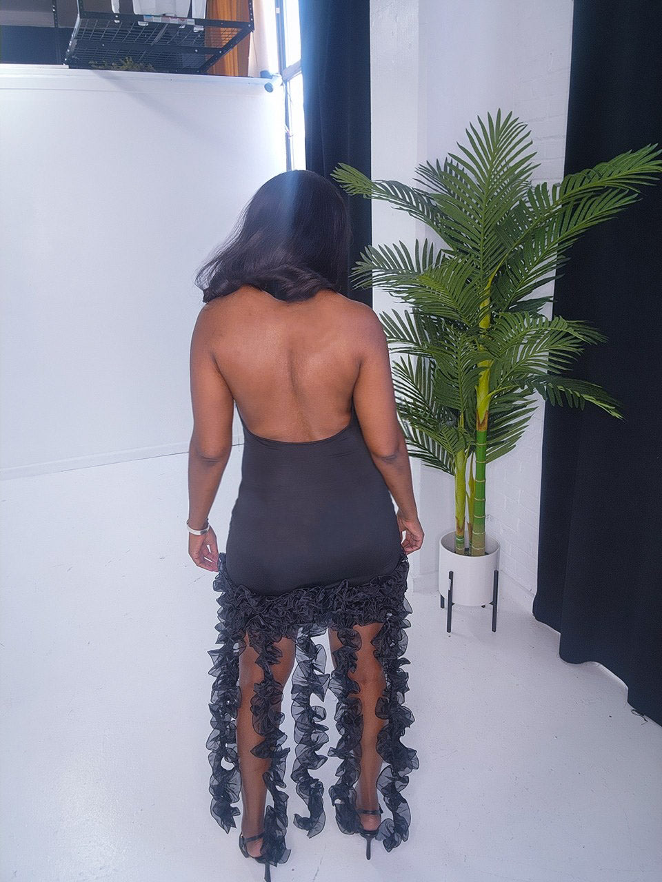 Deep V cut ruffle detail, ruffle tassel black ruched dress.